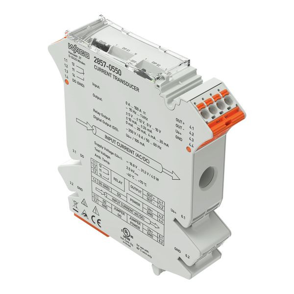 Der Strommessumformer dient zum Erfassen von Gleich- und Wechselströmen im Messbereich bis AC/DC 100 A. Ausgangsseitig wandelt er die Messgröße in ein analoges Normsignal um.