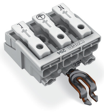 Leuchtenanschlussklemme; Drücker extern; mit abgewinkeltem PE-Rastkontakt; 3-polig; Leuchtenseite: für eindrähtige Leiter; Inst.-Seite: für alle Leiterarten; max. 2,5 mm²; Umgebungstemperatur max. 85 °C (T85); weiß