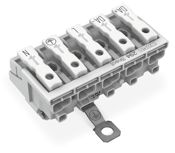 Leuchtenanschlussklemme; Drücker extern; für Linect®; mit PE-Schraubkontakt; DA+ DA- L PE N; 5-polig; Kod. I; Leuchtenseite: für eindrähtige Leiter; Inst.-Seite: für alle Leiterarten; max. 2,5 mm²; Umgebungstemperatur max. 85 °C (T85); weiß