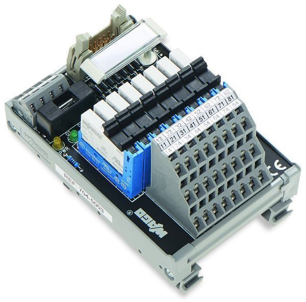 Übergabemodul für Systemverkabelung; Steckverbinder gemäß DIN 41651; Stiftleiste; 10-polig; 8-Kanal-Relaisausgang; 1 Wechsler; Dreistock-Leiterplattenklemmen; im Montagesockel; 2,50 mm²