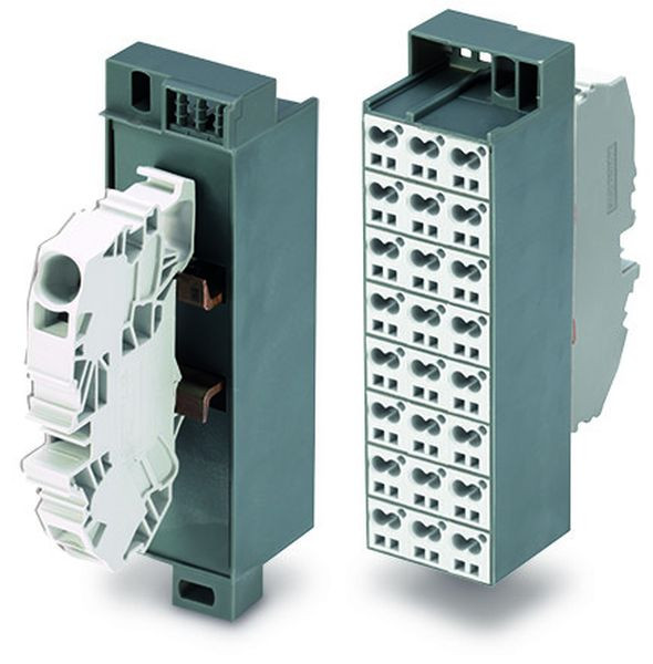 Potentialblock; Aufdruck 1-24; mit 1 Einspeiseklemme inkl. Abschlussplatte; Kammerfarbe einheitlich weiß; Kammerkennzeichnung in senkrechter Linie; für 19"-Gestelle; Schmale Bauform; weiß/dunkelgrau