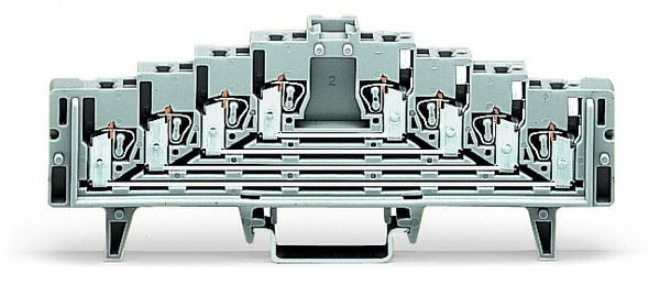 4-Etagen-Rangierklemme; ohne Rasthaken; ein Potential je Ebene; mit Prüföffnung Ø 2,3 mm; Aufdruck: a-b-c-d--d-c-b-a; für Tragschiene 35 x 7,5; 1,5 mm²; grau