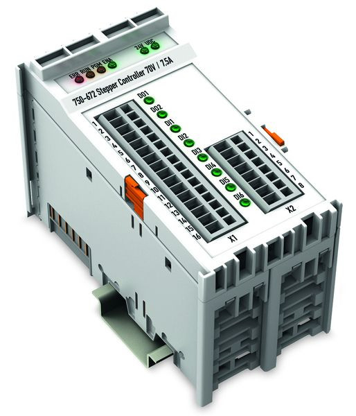 Der 750-672 ist ein intelligenter Steppercontroller mit eigener Leistungsstufe zur Ansteuerung 2-phasiger Steppermotoren bis 70 V/7,5 A.