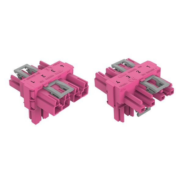 T-Verteiler; 4-polig; Kod. B; 1 Eingang; 2 Ausgänge; 3 Verriegelungsklinken; für fliegende Verbindungen; pink