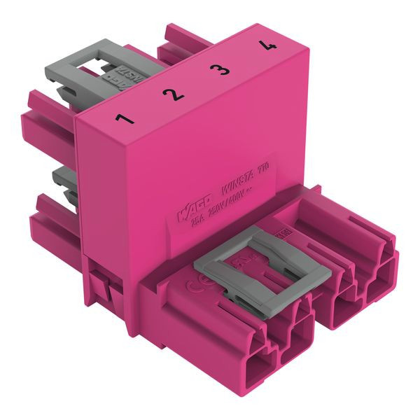 h-Verteiler; 4-polig; Kod. B; 1 Eingang; 2 Ausgänge; einseitige Abgänge; 3 Verriegelungsklinken; für fliegende Verbindungen; pink