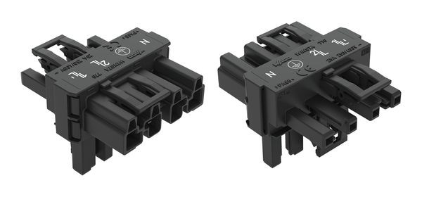 | Kurzbeschreibung | T-distribution connector 1 x plug / 2 x socket 4-pole black |