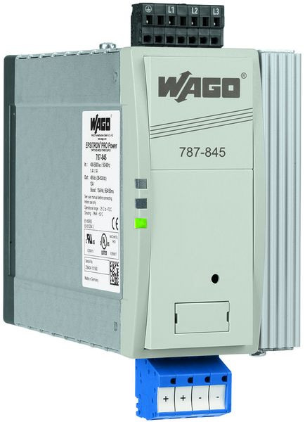 EPSITRON®-PRO-Power, primärgetaktet,mit Weitbereichseingang (AC 340-550V) und stabilisierter, einstellbarer Ausgangsspannung DC 24V, hoher Wirkungsgrad, integrierter PowerBoost (bis zu 100% mehr Ausgangsleistung für 4s) und TopBoost (zusätzlicher Ausgangsstrom von bis zu 60A für 50ms, zur ausgangsseitigen Absicherung mit klassischen Leitungsschutzschaltern)