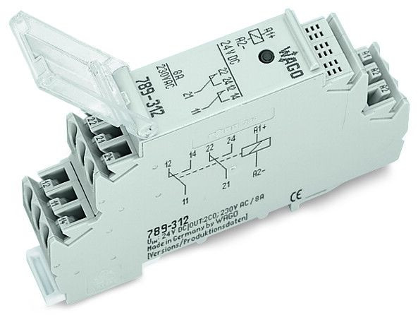 CAGE CLAMP®-Anschluss, 0,08-2,5 mm² Relaismodul; Eingangsnennspannung DC 24 V; 2 Wechsler; Grenzdauerstrom 8 A; Statusanzeige rot; 18 mm Baubreite; 2,50 mm²; grau