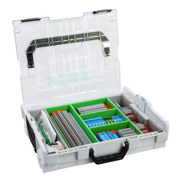Bestückung: 50 x Installationsetagenklemme; NT/L/PE; 2,5 mm² (2203 7641), 10 x Installationsetagenklemme; L/L; 2,5 mm² (2203 7642), 10 x Abschluss- und Zwischenplatte (2203 7692), , 5 x Installationsetagenklemme; NT/L/PE; 4 mm² (2205 7641), 5 x Installationsetagenklemme; L/L; 4 mm² (2205 7642), 5 x Abschluss- und Zwischenplatte (2205 7692), 9 x 2-Leiter-Verteilereinspeiseklemme; grau; 16 mm² (2016 7601), 3 x 2-Leiter-Verteilereinspeiseklemme; blau; 16 mm² (2016 7604), 3 x 2-Leiter-Schutzleiterklemme; grün-gelb; 16 mm² (2016 7607), 10 x Abschluss- und Zwischenplatte (2016 7692), 6 x 1-Leiter-N-Trennklemme; blau; 16 mm² (2016 7714), 5 x Abschluss- und Zwischenplatte (2016 7792), 5 x Schraubenlose Endklammer; 10 mm breit (249 117), 6 x Sammelschienenträger; mit Endklammerfunktion (2009 305), 5 x Sammelschienenträger; nicht als Endklammer verwendbar (2009 304), 4 x Sammelschiene; verzinnt; 0,25 m (210 133), 4 x Sammelschienenabdeckung; transparent; 0,25 m (777 303), 10 x Schachtelbrücker; 3-fach (2002 473), 10 x Schachtelbrücker; 5-fach (2002 475), 10 x Schachtelbrücker; 7-fach (2002 477), 10 x Kammbrücker; 2-fach (2002 402), 5 x Kammbrücker; 2-fach (2016 402), 2 x Prüfstecker; Ø 2 mm (210 136), 2 x Prüfabgriff; für max. 2,5 mm² (2009 182), 5 x Schaltsperre; zum Sichern des Trennschlittens; für Serie 2003 (2003 7300), 5 x Schaltsperre; zum Sichern des Trennschlittens; für Serien 2002 und 2005 (2005 7300), 5 x Schaltsperre; zum Sichern des Trennschlittens; für Serien 2006 und 2016 (2006 7300), 4 x Beschriftungsstreifen; weiß; 0,25 m (2009 110), 2 x WMB-Beschriftungskarte; unbedruckt (793 5566), 2 x WMB-Beschriftungskarte; 1 … 50 (793 5501), 1 x WMB-Beschriftungskarte; L1, L2, L3, N, PE (793 5472), 1 x Betätigungswerkzeug (2009 310), 1 x Faserschreiber (210 110)