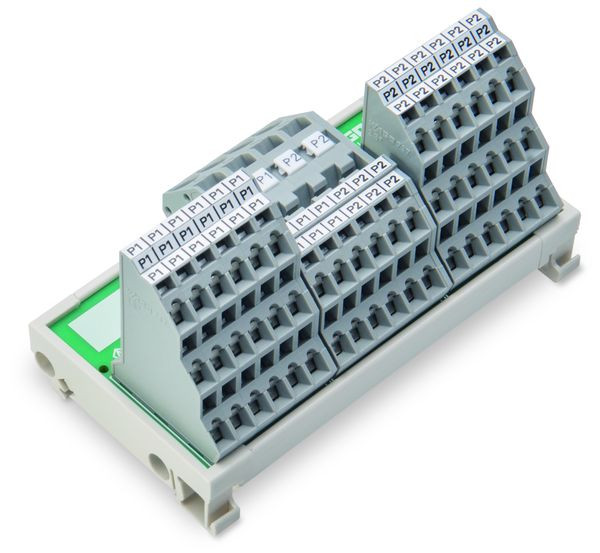 Potentialverteilermodul; 2 Potentiale; mit je 2 Einspeiseklemmstellen; Leiterquerschnitt bis 6 mm²; mit je 24 Ausgangsklemmstellen; Leiterquerschnitt bis 2,5 mm²; grau