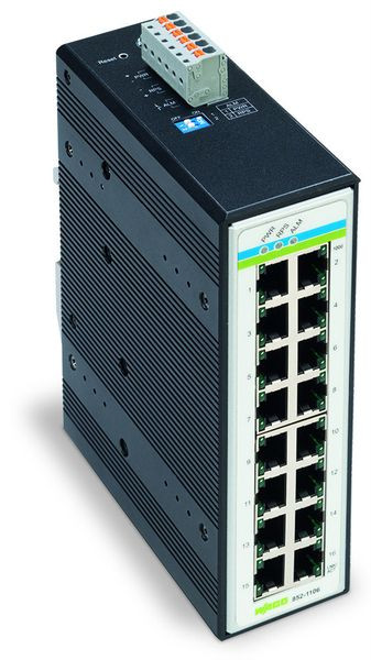 Der Switch 852-1106 ist ein industrieller Unmanaged-ETHERNET-Switch mit 16 Gigabit-ETHERNET-Ports für den einfachen Aufbau von kleinen bis mittleren Netzwerken. Die schmale Bauform mit Tragschienenadapter ermöglicht eine einfache Installation im Schaltschrank bei hoher Vibrations- und Schockbeständigkeit. Die automatische Erkennung der Übertragungsrate (Autonegotiation) sowie die selbstständige Ermittlung der Sende- und Empfangsleitungen (Auto MDI-X) ermöglichen einen einfachen „Plug & Play“-Betrieb und helfen so Kosten und Zeit bei der Inbetriebnahme zu sparen. Status-LEDs, eine redundante Spannungsversorgung sowie ein per Dip-Schalter konfigurierbarer Alarmkontakt erhöhen die Redundanz- und Diagnosefähigkeit des Switches und sorgen damit für eine höhere Verfügbarkeit während des Betriebs.