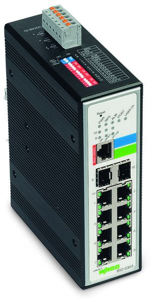 Der Switch 852-303 ist ein industrieller, konfigurierbarer ETHERNET-Switch mit 8 Ports 10/100BASE-TX und 2 SFP-Slots 100BASE-FX / 1000BASE-FX/SX (SFP-Module sind optional erhältlich).