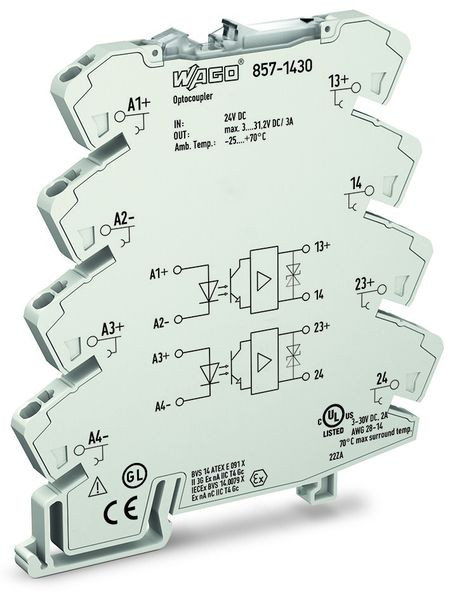 Optokopplermodul; 2-fach; Eingangsnennspannung DC 24 V; Ausgangsspannungsbereich DC 3 … 31,2 V; Grenzdauerstrom 3 A; 2-Leiter-Anschluss; Statusanzeige gelb; 6 mm Baubreite; lichtgrau
