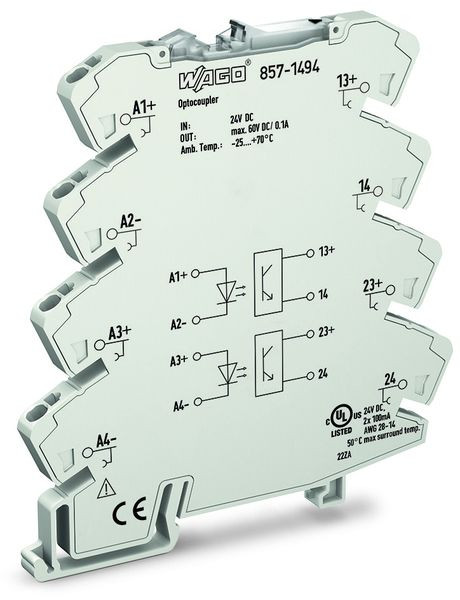 Optokopplermodul; 2-fach; Eingangsnennspannung DC 24 V; Ausgangsspannungsbereich DC 9 … 60 V; Grenzdauerstrom 0,1 A; 2-Leiter-Anschluss; Statusanzeige gelb; 6 mm Baubreite; lichtgrau