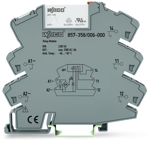 Relaismodul; Eingangsnennspannung AC 230 V; 1 Wechsler; Grenzdauerstrom 6 A; mit integriertem Grundlastmodul; Statusanzeige gelb; 6 mm Baubreite; 2,50 mm²; grau