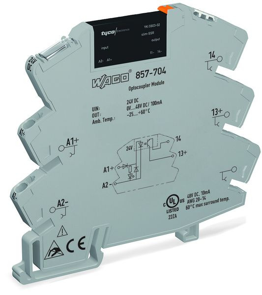 CAGE CLAMP®S-Anschluss 0,08-2,5 mm2 Solid-State-Relaismodul; Eingangsnennspannung DC 24 V; Ausgangsspannungsbereich DC 0 … 48 V; Grenzdauerstrom 0,1 A; Statusanzeige gelb; 6 mm Baubreite; grau