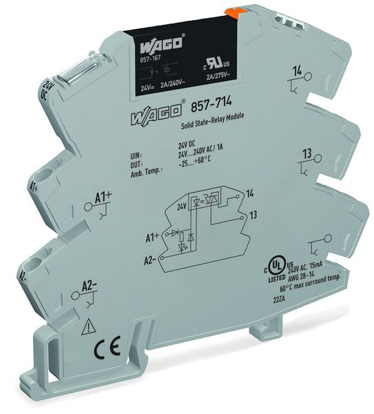 CAGE CLAMP®S-Anschluss 0,08-2,5 mm2 Solid-State-Relaismodul; Eingangsnennspannung DC 24 V; Ausgangsspannungsbereich AC 24 … 240 V; Grenzdauerstrom 2 A; 2-Leiter-Anschluss; nulldurchgangsschaltend; Statusanzeige gelb; 6 mm Baubreite; grau