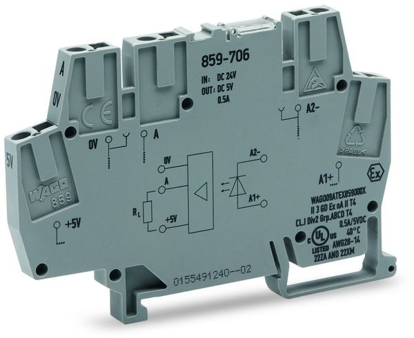 Optokopplermodul; Eingangsnennspannung DC 24 V; Ausgangsspannungsbereich DC 4 … 6,25 V; Grenzdauerstrom 0,5 A; 3-Leiter-Anschluss/minusschaltend; Frequenz 20 kHz; Statusanzeige rot; 6 mm Baubreite; grau