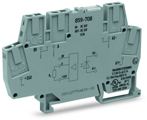 Optokopplermodul; Eingangsnennspannung DC 24 V; Ausgangsspannungsbereich DC 15 … 30 V; Grenzdauerstrom 1 A; 3-Leiter-Anschluss/minusschaltend; Frequenz 15 kHz; Statusanzeige rot; 6 mm Baubreite; grau