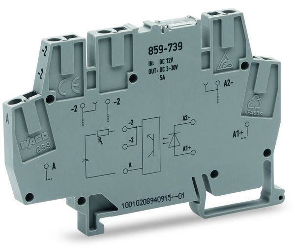 Optokopplermodul; Eingangsnennspannung DC 12 V; Ausgangsspannungsbereich DC 3 … 30 V; Grenzdauerstrom 5 A; 2-Leiter-Anschluss; Statusanzeige rot; 6 mm Baubreite; grau
