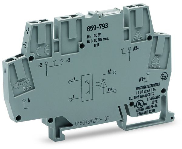 Optokopplermodul; Eingangsnennspannung DC 5 V; Ausgangsspannungsbereich DC 3 … 60 V; Grenzdauerstrom 0,1 A; 2-Leiter-Anschluss; Bahn; 6 mm Baubreite; grau
