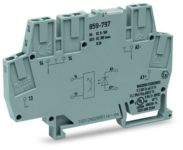 Optokopplermodul; Eingangsnennspannung DC 12 V; Ausgangsspannungsbereich DC 3 … 30 V; Grenzdauerstrom 0,5 A; 2-Leiter-Anschluss; Statusanzeige rot; 6 mm Baubreite; grau
