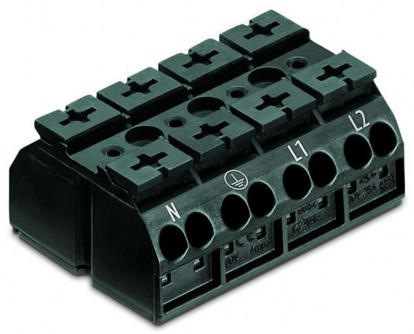 4-Leiter-Geräteanschlussklemme; ohne PE-Kontakt; N-PE-L1-L2; 4-polig; 1 Rastfuß pro Pol; 4 mm²; schwarz