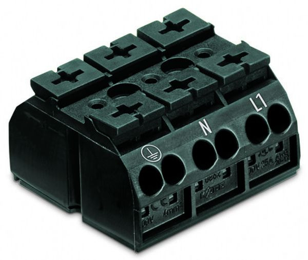 4-Leiter-Geräteanschlussklemme; mit PE-Kontakt; PE-N-L1; 3-polig; 1 Rastfuß pro Pol; 4 mm²; schwarz