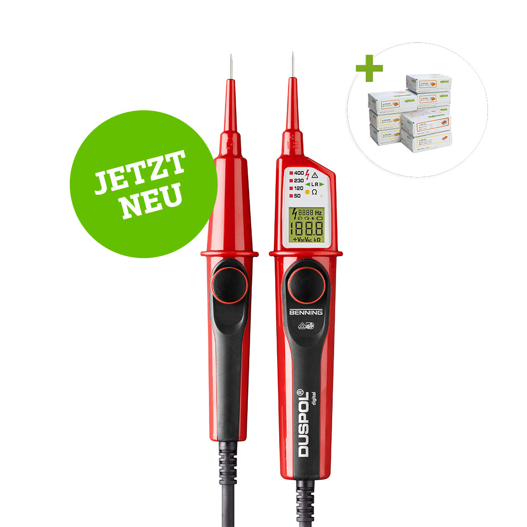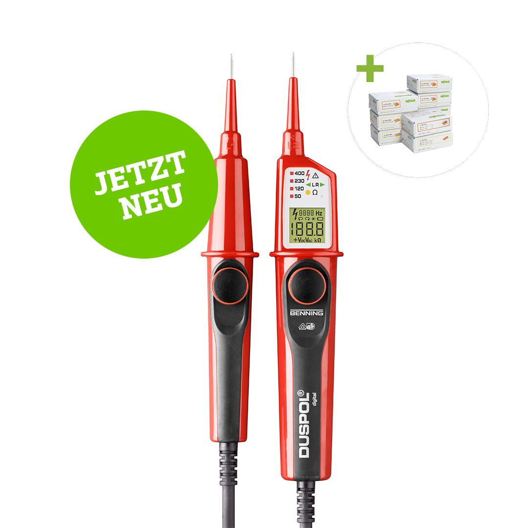 - 1 Stück Spannungsprüfer Benning DUSPOL® digital, beleuchtetes LC-Display, Spannungsprüfung bis AC 1000 V, TRUE RMS/DC 1200 V, akustische und optische Durchgangsprüfung, Diodenprüfung, Widerstands- und Frequenz-messung, Drehfeld- und Polaritätsprüfung, einpolige Außenleiterprüfung, Kabelbruchdetektor, Vibrationsalarm, Lastzuschaltung über Drucktaster, Messstellenbeleuchtung, robustes Gehäuse mit gummierter Grifffläche, für Außeneinsatz, Schutzart IP65, Überspannungsschutz Cat. IV 600 V