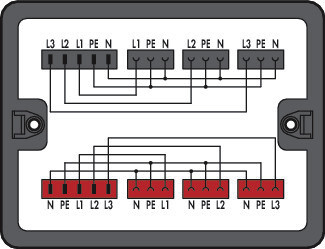 Verteilerbox; Dreh- auf Wechselstrom (400 V/230 V); 2 Eingänge; 6 Ausgänge; Kod. A, P; MIDI; schwarz