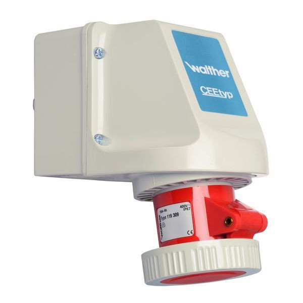 WALTHER Wandsteckdose 16A 3P 400V 9h IP67 aus PA6-Material mit Schraubanschluss mit zwei Kabeleinführungen oben und unten und einer ausbrechbaren Bodeneinführung zur Innenbefestigung