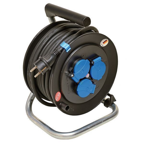 | Kurzbeschreibung | Sicherheits-Kabeltrommel 230V mit 3 Schutzk.-Steckdosen und Anschluss über 50m Gummischlauchleitung H07RN-F3G1,5 mit Schutzk.-Stecker |