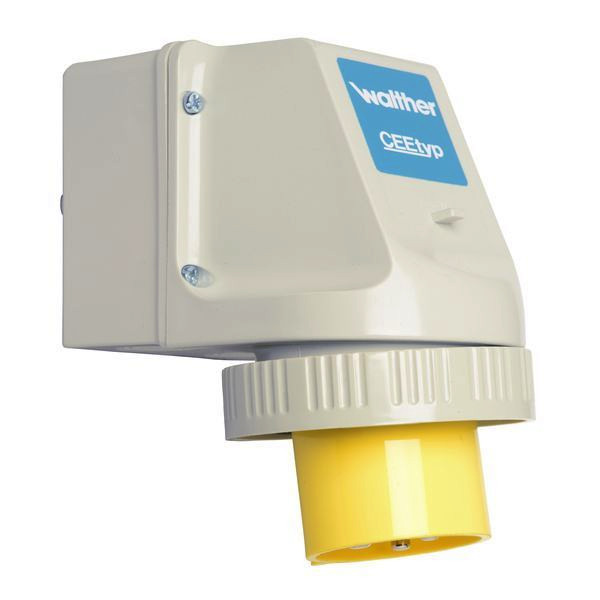 WALTHER Wandgerätestecker 16A 4P 110V 4h IP67 aus PA6-Material mit zwei Kabeleinführungen oben und unten und einer ausbrechbaren Bodeneinführung zur Innenbefestigung