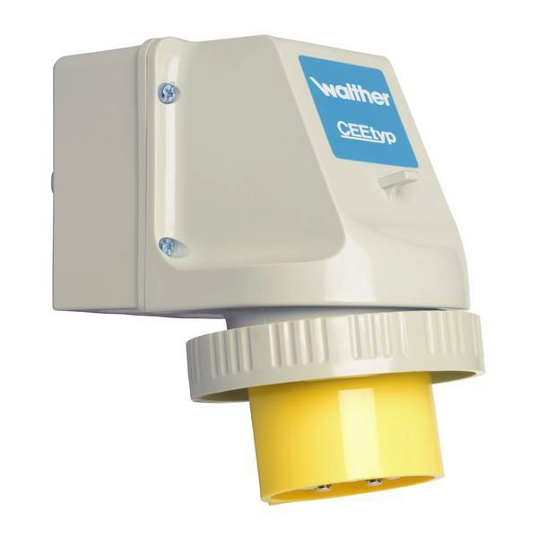 WALTHER Wandgerätestecker 16A 5P 110V 4h IP67 aus PA6-Material mit zwei Kabeleinführungen oben und unten und einer ausbrechbaren Bodeneinführung zur Innenbefestigung