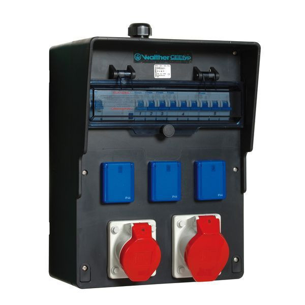 | Kurzbeschreibung | Solid-rubber socket combination In: 63A with one RCD Type A, five MCBs, two CEE outlets 16-32A, three Schuko sockets and terminal set K25 10P |
