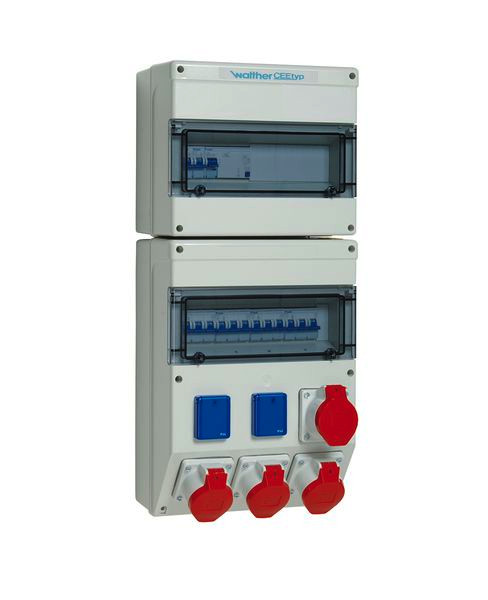 | Kurzbeschreibung | Kunststoff-Steckdosenkombination In: 63A mit einem RCD TypA, 6 MCBs TypC u. TypB, 4 CEE-Abgänge 16A, 2 Schukos und Klemmsatz K25 10P |