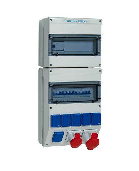 | Kurzbeschreibung | Kunststoff-Steckdosenkombination In: 63A mit einem RCD TypA, 8 MCBs, 2 CEE-Abgänge 16-32A, 6 Schukos und Klemmsatz K25 10P |