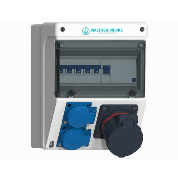 WALTHER Kunststoff-Steckdosenkombinationnach IEC 61439-Teil 1 und 3Gehäuse (692) aus silikon- und halogenfreiem PC/ABS Farbe: ähnlich RAL 7035 -lichtgrau- mit oben einrastendem KlarsichtdeckelSchutzklasse IIBrennbarkeitsklasse V0Schutzart: IP54Größe ca.: 237 x 183 x 152mm / H-B-T Anschluss:2 Vorprägungen oben und unten M25/M32/M401 Anschluss bis 25qmm 10P Abgänge/ Absicherung:1 Fehlerstromschutzschalter (RCD) 4P 40A/30mA -A-1 NEO CEE Anbaudose gerade 16A 5P 400V 6h mit Leitungsschutzschalter (MCB) 3P 16A -C-2 Schutzkontaktsteckdosen 16A 3P 230V mit je 1 Leitungsschutzschalter (MCB) 1P 16A -C- Steckdosenkombination nach DIN EN 61439:stückgeprüftanschlussfertig verdrahtetBemessungsstrom: 32A