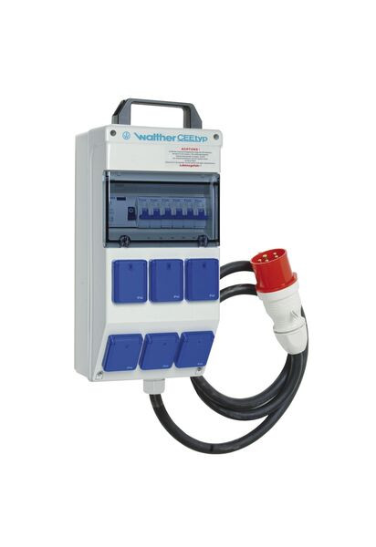 | Kurzbeschreibung | Tragbare Kunststoff-Steckdosenkombination In: 32A mit einem RCD TypA, 6 MCBs TypB, 6 Schukos und Anschluss über eine Leitung mit 32A Stecker |
