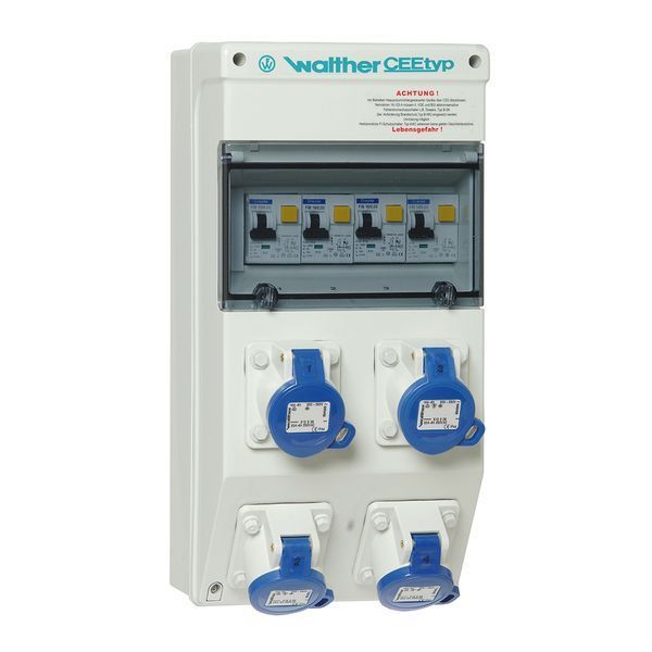 WALTHER Kunststoff-Steckdosenkombinationnach IEC 61439-Teil 1 und 3Gehäuse (698) aus silikon- und halogenfreiem PC/ABS Farbe: ähnlich RAL 7035 - lichtgrau - Schutzklasse IIBrennbarkeitsklasse V0Schutzart: IP44Größe ca.: 370 x 183 x 151mm / H-B-TAnschluss:2 Vorprägungen oben und unten M25/M32/M401 Klemmsatz K25 10P Abgänge/ Absicherung:4 Fehlerstrom-/Leitungsschutzschalter Kombination (RCBO) 2P 16A/30mA -B-4 CEE-Anbaudosen schräg 16A 3P 230V mit abschließbarem Klappdeckel inkl. Öse für VorhängeschlossSteckdosenkombination nach DIN EN 61439:stückgeprüftanschlussfertig verdrahtetBemessungsstrom: 40A