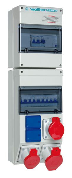 | Kurzbeschreibung | Kunststoff-Steckdosenkombination In: 63A mit einem RCD TypA, 5 MCBs, 3 CEE-Abgänge 16-32A, 2 Schukos und K25 10P |