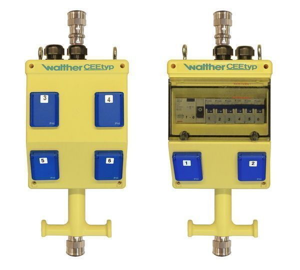 | Kurzbeschreibung | Kunststoff-Hängesteckdosenkombination In: 32A mit einem RCD TypA, 6 MCBs, 6 Schukos, Anschluss bis 6qmm 5P und Druckluftanschluss |