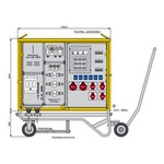 | Kurzbeschreibung | Mobiler Fest-und Marktplatzverteiler mit Zählerplatz, 3 RCDs TypA, 10 LS, 6 CEE-Abgängen 16-63A und 6 Schukos |