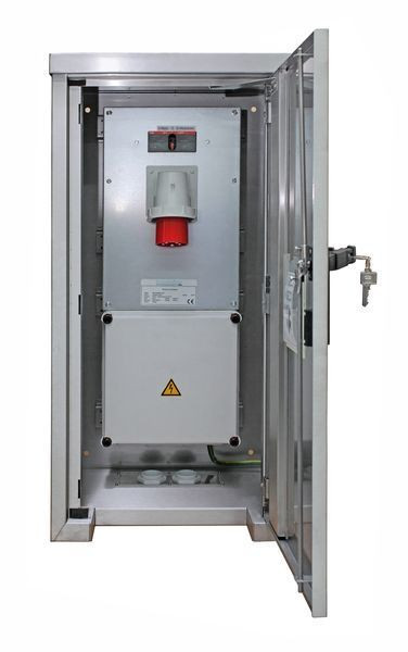 WALTHER Aufputzverteiler aus EdelstahlGehäuse aus Edelstahl gebürstet (Werkstoff 1.4301)ohne Lackierungmit Bohrungen zur Befestigung an der WandEinfachtür und 3-Punkt-Stangenschloss sowie Schwenkhebelmit Profilhalbzylinder, Schließung G2123sowie Kunststoff-RegenschutzkappeKabeleinführung 2 x M63 von untenKabelausführung bei geschlossener Tür möglichSchutzart: IP44Größe ca.: 985 x 480 x 360mm / H-B-TAnschluss:1 Zugangsklemme 1 x 5 x 50qmm1 CEE-Anbaugerätestecker 125A 5P 400V 6h1 Netz-0-Not-Umschalter 4P 125A Typ: ABB OT 125 F4CAbgang:1 Abgangsklemme 1 x 5 x 50qmm