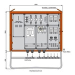 Schrank aus elektrolytisch verzinktem Stahlblech, mit Kunststofflackierung RAL 2004 orange, Kranösen, schwenkbar, Hauptsicherung als Lasttrennschalter, abschließbar mit Vorhängeschloss, Untergestell feuerverzinkt mit Laschen für Erdnägel, Kabelabfangschellen / Zugentlastung, einheitliches Flanschmaß für CEE-Steckdosen von 16 A bis 125 A, daher einfache Umrüstung, großzügige Anschlussräume, Betriebsspannung: 230/400 V, 50 Hz, Schutzart: IP 44, Meßeinrichtung IP 54, inkl. feuerverzinktem Untergestell mit Ösen für Erdnägel
