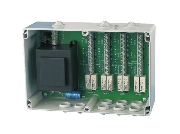 Etagenbedienung von bis zu 4 Fassaden über anschließbare JalousieschalterTotmannverhalten führt den Fahrbefehl so lange aus, wie der Schalter betätigt wirdVersorgung von Steuergeräten ohne integriertes Netzteil (z. B. MSE Piccolo, Uniswitch ZL)4 potentialbehaftete Ausgänge (24 V DC, max. 2 A)