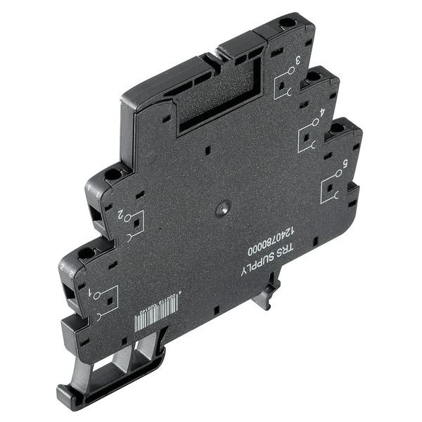 Ein Einspeisemodul stellt zusätzliche Anschlüsse zur Einspeisung von querverbundenen Potentialen zur Verfügung. Es wird mit verschiedenen Anschlusstechniken als Zubehör für die entsprechenden Relaisfamilien angeboten.
