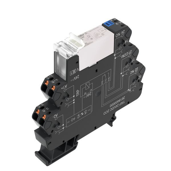 Baugruppe aus Steckrelais und Stecksockel. Steuerstromkreis und Laststromkreis sind galvanisch getrennt.