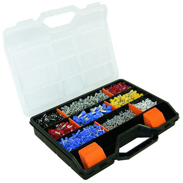 Aderendhülsen in Kunststoff-Boxen mit drehbarem transparenten Deckel.