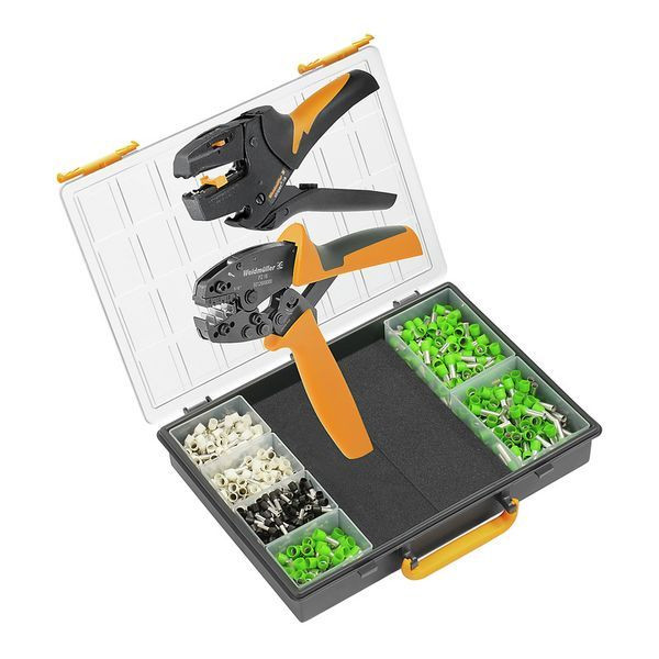 Sortimentskasten mit Crimpwerkzeug, Abisolierwerkzeug und Aderendhülsen zum Schneiden, Abisolieren und Crimpen. Aus dem gut geordneten Sortiment, resultieren minimierte Such- und Vorbereitungszeiten.